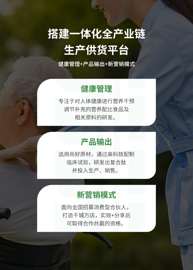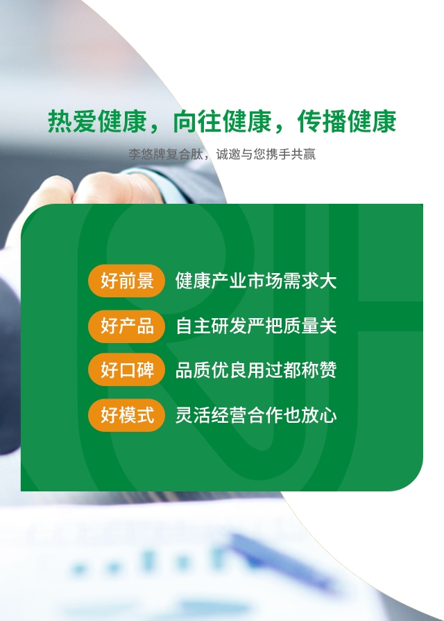 公司斥巨资组建研发团队,运用高科技配制,推出由11种小分子肽原料配方而成的产品——李悠牌复合肽,广泛应用于各种人群,并获得良好的产品口碑。公司现决定面向全国各省市地区招募消费型合伙人,打造千城万店,为社会各界人士提供收获健康与财富的事业平台。